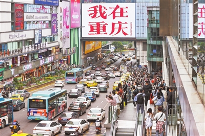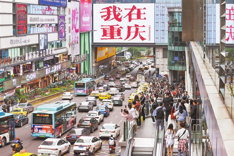 4月26日,江北区观音桥“我在重庆”热门打卡点,不少市民、游客正在拍照打卡。
