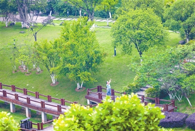 5月15日,大足区永定河湿地公园绿意盎然,市民迎着晨曦锻炼身体。