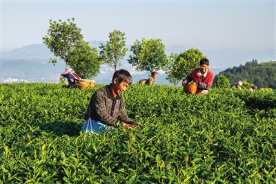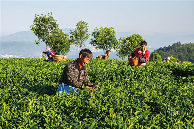 近日,綦江区石角镇新农村茶山,采茶工人腰挎茶篓,穿梭于一垄垄茶叶绿海中,手指在茶树间不停翻飞,采取一片片嫩绿。