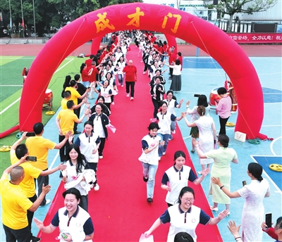 图为萱花中学高三学子在教师的祝福声中,依次迈入“成长门、成才门、成功门”。