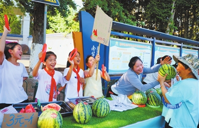 本报讯(渝西都市报记者 肖必胜/文 刘 灿/图)“西瓜!西瓜!好吃不贵,价格实惠!”“走过路过,机会不要错过!”“3元1斤,3元1斤,自己种的西瓜,没使用化肥农药,口味正宗!”……6月11日下午,永川区南华宫小学大门外热闹非凡,一溜摊位铺展开来,孩子们的叫卖声、欢呼声炸开了锅,该校以“瓜趣童心,乐享丰收”为主题的首届校园西瓜节暨思善农场劳动教育成果展在这里火热举行。