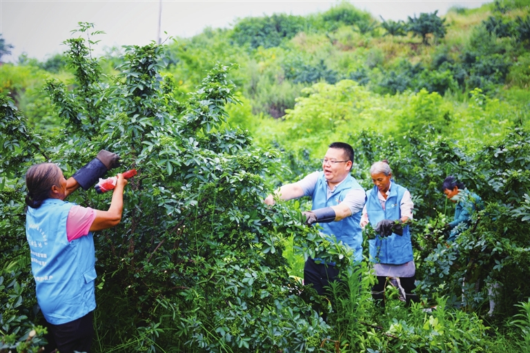 6月18日,大雨刚过,天气凉爽。永川区板桥镇通明村毫田村民小组的花椒基地里,正上演着一幕抢收花椒的忙碌场景:有的村民将一枝枝沉甸甸的花椒从树上剪下,有的则忙着将花椒枝条运至转运车上……