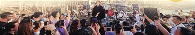夕阳西下,金灿灿的余晖随着江水四溅,市民、游客来到甲板,在律动十足的背景乐中与重庆来福士、洪崖洞等城市地标和热门景点合影。“在如画的风景中,沉浸式感受音乐会,太嗨了!”市民余女士激动地说,很喜欢这样的视觉听觉双重盛宴。