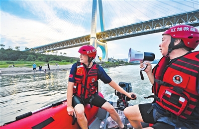 6月17日,大渡口区滑石滩江边,红旭水上救援队队员们驾驶冲锋舟巡逻,劝导市民。