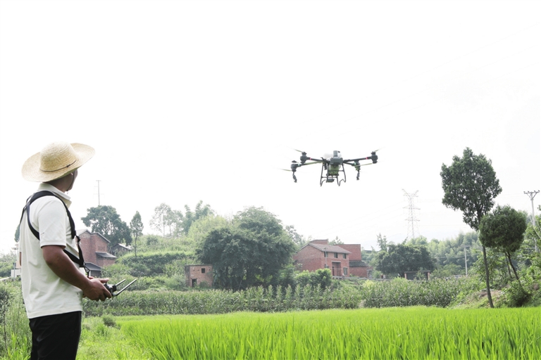 本报讯 (渝西都市报记者 陈仕川 实习生 刘峥岩 文/图)7月11日,永川区三教镇陡沟河村千亩良田绿意盎然,该村农机服务专业合作社技术人员操作植保无人机穿梭于连片稻田,精准执行喷洒作业,成为保障粮食安全、助推乡村振兴的一道亮丽风景。