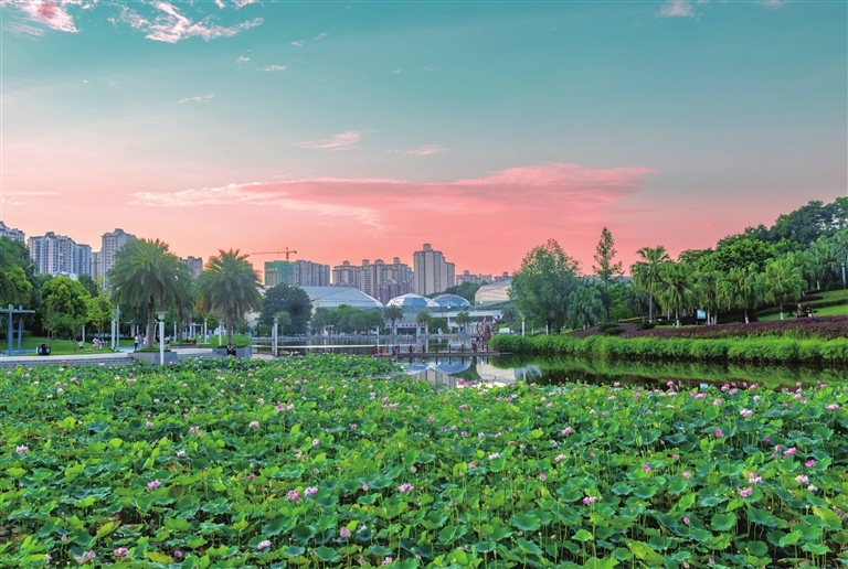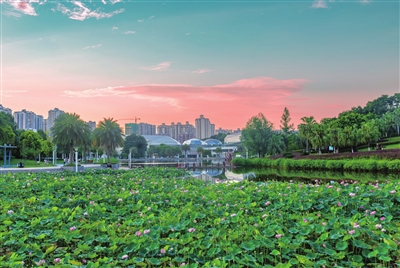 7月12日傍晚,大足区海棠公园内荷花盛放,与空中的霞光交相辉映,成为夏日里一道靓丽的风景线。不少市民驻足观赏,享受着这份夏日的宁静与惬意。