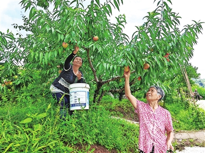 7月13日清晨,百丈村村民陈兰挑着满满两箩筐桃子来到百丈村2组的路边,这里已经围满前来卖桃的村民。来自重庆双福农贸市场的商贩早就将货车停在此处,忙碌地挑拣桃子、分类、称重、付款。“我家种了5亩多的桃树,一年下来卖桃子收入接近3万元,现在路修通了,商贩来家门口收桃子也方便,日子越过越好了……”陈兰微笑着说道。“为扶持产业发展,村里筹资修建泵房抽水,进行村路修整,解决了灌溉和入园交通问题。”百丈村党支部副书记周贵川介绍说,百丈村桃树种植面积有1200余亩,目前百花桃、胡桃均已陆续成熟上市,预计产量约500吨,产值300余万元。