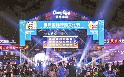 7月11日晚,2025不夜重庆生活节暨第三届重庆国际啤酒文化节在九龙坡区杨家坪步行街开幕。图为啤酒节巴国城现场。