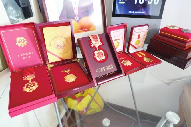 阳光穿过客厅,落在老人的脸上。不远处,桌子上的一枚枚纪念章,仿佛在光影中与历史共鸣。