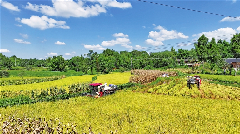 “我们季家镇是大足区水稻收割较早的镇街之一,全镇11500亩水稻已经陆续进入收割期,得益于适宜的气候和科学的种植管理,今年我镇水稻整体呈现出穗大粒满、产量稳中有升的良好态势,预计亩产将保持稳定增长,能为全镇粮食安全打下坚实基础。”季家镇产业发展服务中心负责人舒嘉奇介绍。