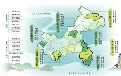 七大避暑目的地为武隆仙女山、丰都南天湖、奉节兴隆镇、涪陵武陵山、石柱黄水、酉阳菖蒲盖、江津四面山。这些地方海拔均在1000米以上,夏季最高气温均在20℃左右,适于避暑。