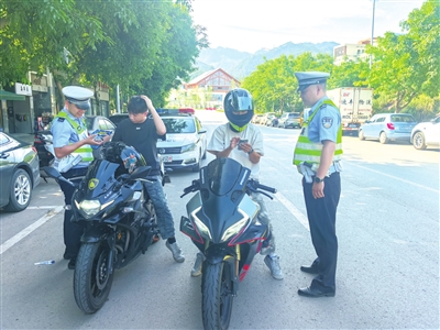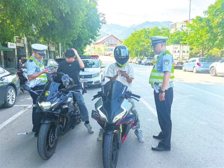 夏日炎炎,热浪袭人。在万达路口,永川区公安局交巡警支队第一勤务大队民警钟杰、蒋宗智的警服后背已被汗水浸透一大片。他们紧盯着车流,一边疏导交通,一边精准拦停一辆未戴头盔的摩托车骑手:“师傅,天热头盔闷,但安全更重要!”