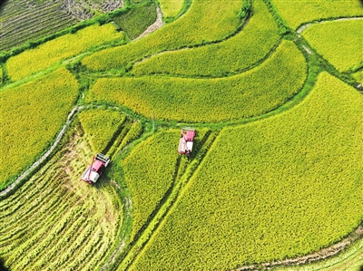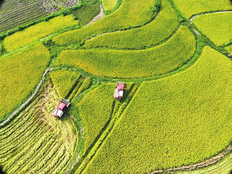 在荣昌区万灵镇尚书村的水稻田里,两台联合收割机正来回穿梭,切割、脱粒、秸秆粉碎一气呵成,短短1小时便完成了15亩水稻的收割。“以前人工割稻,一家5口人收10亩地要忙一周,现在请台收割机,大半天就能收完,还能直接把稻谷运回家。”种植户廖国发看着满仓的稻谷,难掩喜悦。