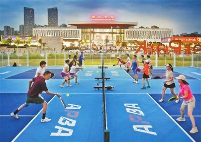 当日,重庆两江新区天宫殿街道志愿者公园的匹克球场地正式免费向市民开放。其中,夜光匹克球颇受市民青睐。夜幕降临后,发光的球与球拍成为一道独特的风景线。市民们在夜色中享受运动乐趣,尽显重庆全民健身的蓬勃活力。