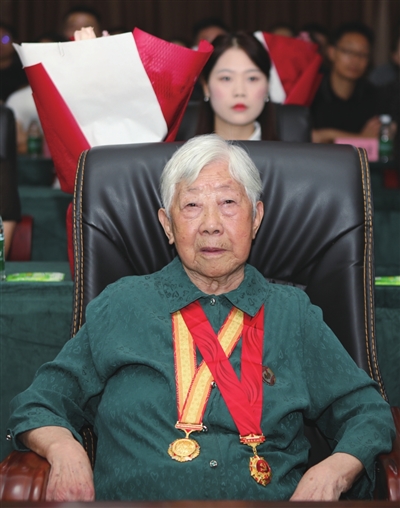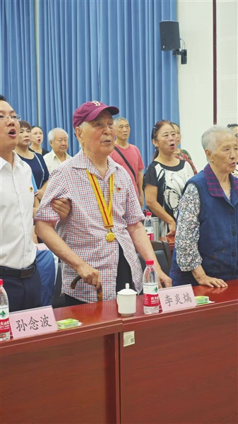 国歌奏响时,李老在工作人员的搀扶下倚杖站立,低声跟唱,眼中泛起泪光。