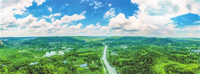 近日,航拍下的大足区城郊一片天蓝地绿、欣欣向荣的景象。