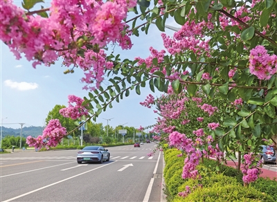 初秋时节,宝棠大道两旁的紫薇花竞相绽放,装点着城市。近年来,大足区在打造生态宜居城市中,持续推进见缝插“绿”,在城市重要节点、城市主要道路周围合理布绿、植树,既美化了城市,又让市民能“开窗见绿,推门见景”。