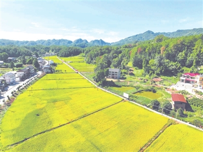 连日来,巴南区石龙镇大兴村田野里的金黄稻浪,与蓝天、白云、青山、民居相互映衬,构成一幅美丽的乡村田园丰收画卷。