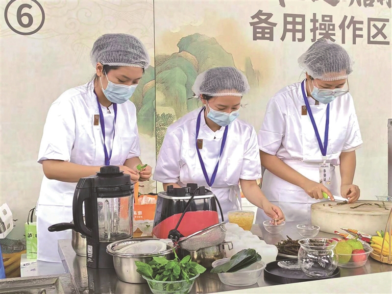 甜品“金盏玉露沁秋梨”香气引人驻足,这是泸州市中医医院参赛队的作品,以泸州道地药材石斛、佛手为主要食材制作而成的。该院脑病科主治医师姜映维介绍,佛手性温,中和石斛、秋梨的寒性,可促进脾胃运化吸收。