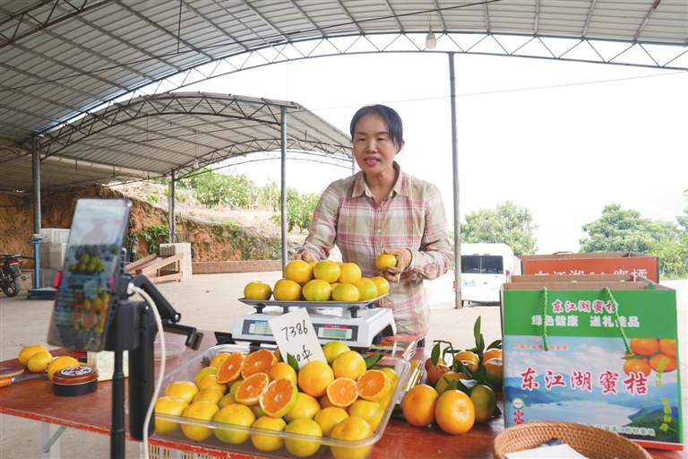“家人们看过来,自家果园刚摘的东江湖蜜橘,皮薄肉嫩,汁水足!”来到刘丽的果园,她正在电商平台直播。