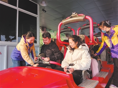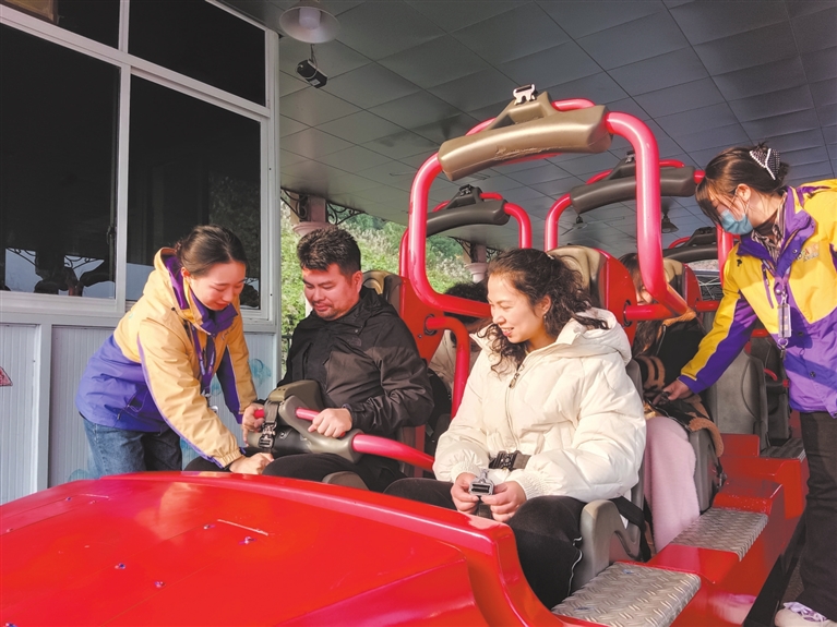 “亲爱的游客朋友,欢迎乘坐十环过山车,请大家系好安全带,将随身物品暂存于储物柜。”伴随着清脆的提示音,邓雯文熟练地检查着游客的安全装备,脸上洋溢着温暖的笑容。这名来自卫星湖街道大竹溪村的姑娘,毕业于重庆财经职业学院,已经在乐和乐都工作了4个年头。
