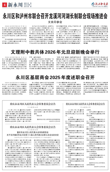重庆市永川区第十八届人民代表大会常务委员会第三十三次会议决定:重庆市永川区第十八届人民代表大会第七次会议于2026年1月20日召开,会期4天。