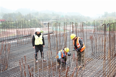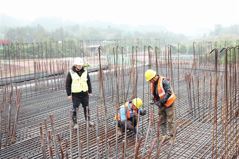 本报讯(渝西都市报记者 陈仕川 文/图)切割声不绝于耳,施工紧张有序。2026年1月1日,永川区双石镇,由中建五局承建的成渝高速公路改扩建项目(重庆段)TJ04标段并未停工。众多建设者在岗位上进行桥台承台钢筋绑扎施工、钢筋加工、混凝土装载、实测实量等作业,用辛勤的汗水确保工程进度,诠释了劳动者的敬业与责任感。