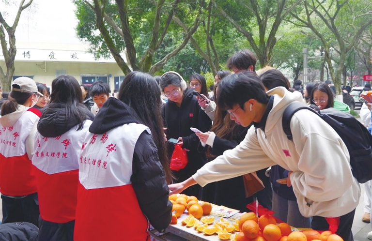 本报讯(渝西都市报记者 陈欣薇 文/图)暖阳洒满校园,果香沁人心脾。2025年12月29日,重庆文理学院青年志愿者协会在校内开展“扶残兴农‘橘’力相助”志愿服务活动,师生们通过爱心义卖,帮助永川区黄瓜山残疾果农陈泽等销售果园中待售的橘子,以行动传递温暖,助力乡村振兴与残疾人帮扶事业。