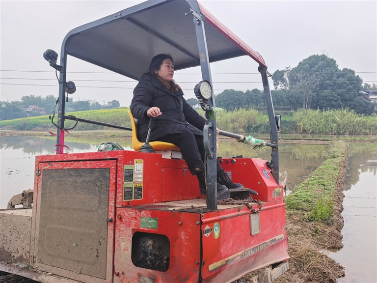 清晨,永川区来苏镇水磨滩村的田野还笼罩着一层薄雾,一阵低沉的轰鸣声已划破宁静——一台旋耕机正驶过田间,翻开湿润的泥土,身后留下整齐的垄沟。不远处,一架农用无人机稳稳升起,在空中划出均匀的航线,将肥料精准撒向田地。在这片忙碌的春耕图景中,一位身穿羽绒服的女子格外醒目。她时而查看机械作业效果,时而与操作员交流几句,手中还握着一本翻旧了的《农机操作指南》。她叫闵西娟,是重庆市永川区幸川农业机械耕作服务专业合作社负责人,与土地和农机打交道已十余年。