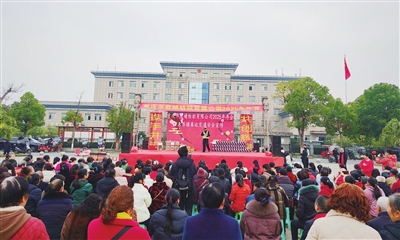 图为工作人员在君婧纺织有限公司年会现场宣讲安全出行相关法规和常识。