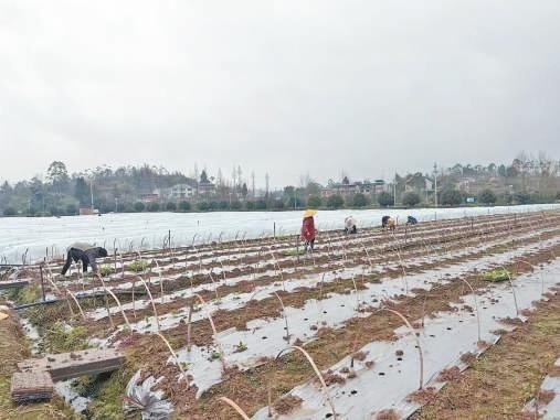 基地里20余名菜农,头戴斗笠、身披蓑衣,有的忙着搬运农资,有的忙着覆盖薄膜,还有的忙着移栽菜秧。