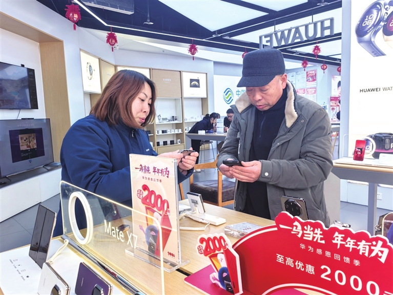 隔壁OPPO店内,大学生小刘刚刚完成支付,脸上兴奋未褪。“看中这款手机两个多月了,国补加上门店优惠,一下子省了800块!”他快速拆开包装盒,给新手机贴上保护膜,“过年走亲戚、拍团圆照,都得靠它了。”店内,键盘敲击声、扫码提示音、包裹封装声此起彼伏,汇成一首繁忙的“年前奏鸣曲”。